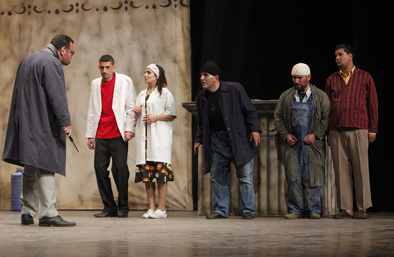 Cette pièce en arabe dialectal d’une heure, réunit, pour une dernière nuit, sur leur lieu de travail et de vie, six personnages qui vont être embarqués dans une histoire de meurtre après la visite impromptue d’un officier de police. Dans un décor unique représentant la réception d’un hôtel vétuste, une femme de ménage veuve et mère de sept enfants, un artiste mégalomane converti en faussaire, un réceptionniste grincheux, un vendeur de sardines typiquement algérois, un enseignant désespéré d’avoir un logement décent et un creuseur de tombes vont disserter de leurs malheurs respectifs, alors que dehors un climat de «guerre» s’est installé. Surpris par l’arrivée d’un policier soupçonneux et brutal, ces personnages hauts en couleur vont tuer par inadvertance leur visiteur nocturne, avant de se lancer dans un simulacre de procès pour désigner un coupable, une situation ubuesque qui sert également de prétexte pour dépeindre, non sans ironie, la situation sociopolitique de l’Algérie des années 1990.