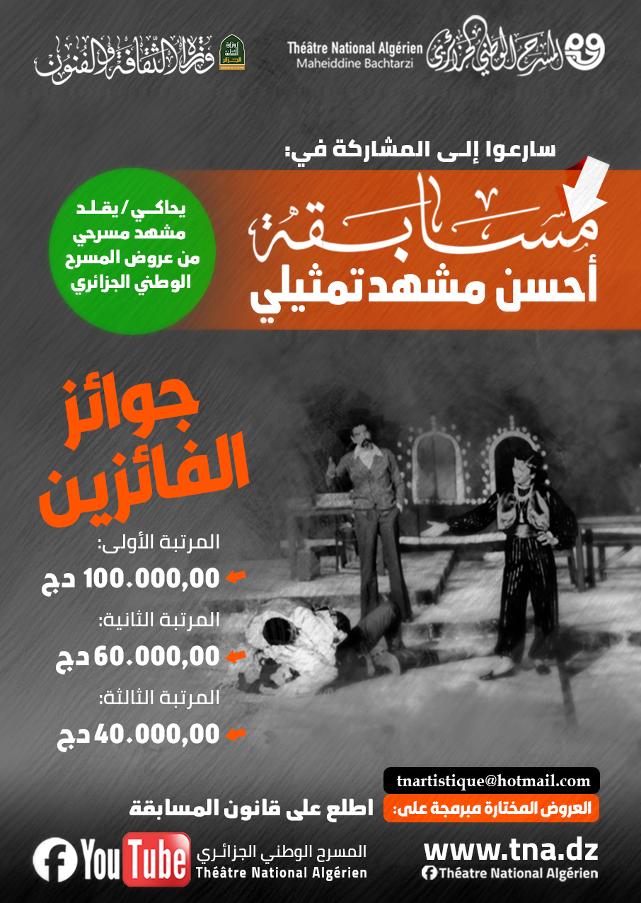 أعلن المسرح الوطني الجزائري منذ فترة، عن تنظيمه لمسابقة “أحسن مشهد تمثيلي” حول عرض مسرحي من إنتاج المسرح الوطني الجزائري، جاء هذا الإعلان ضمن البرنامج الخاص بإحياء الذكرى المزدوجة لعيدي الاستقلال والشباب الموافق لـ 05 جويلية من كل عام.
